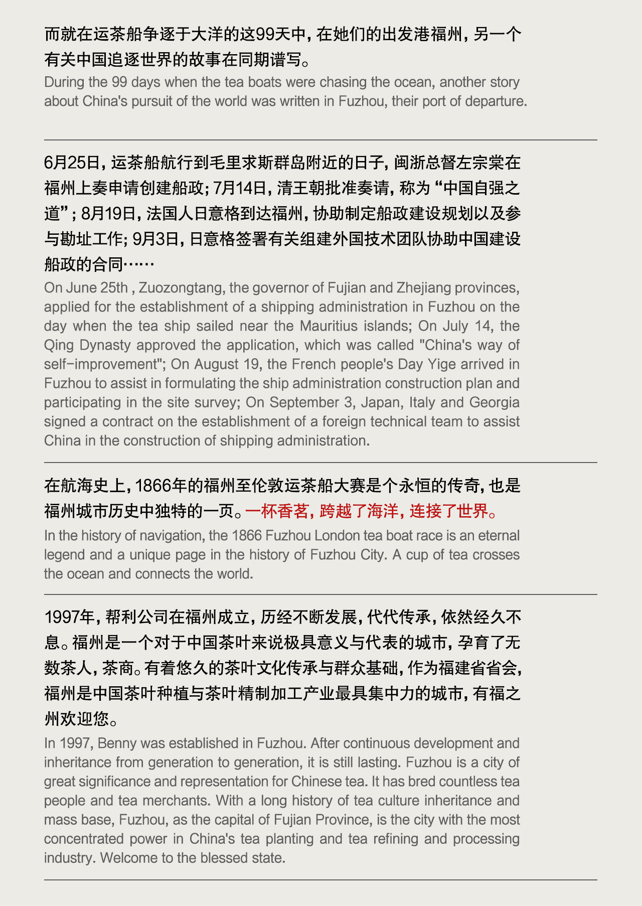 幫利公司起始于中國東南部的福建省省會福州,標志性的閩江在這片土地分流并交匯入海。上世紀末,幫利公司在福州成立,開始涉足茶飲行業,這是關于一個家庭追求夢想的故事,不僅僅是對茶飲,也是對這片土地的熱愛。經歷不斷發展,代代傳承,幫利從最早的奶茶門市生意,發展成一家專注于餐飲用茶與供應鏈的公司,26 年來,依然激情生長、繁榮、且經久不息。...